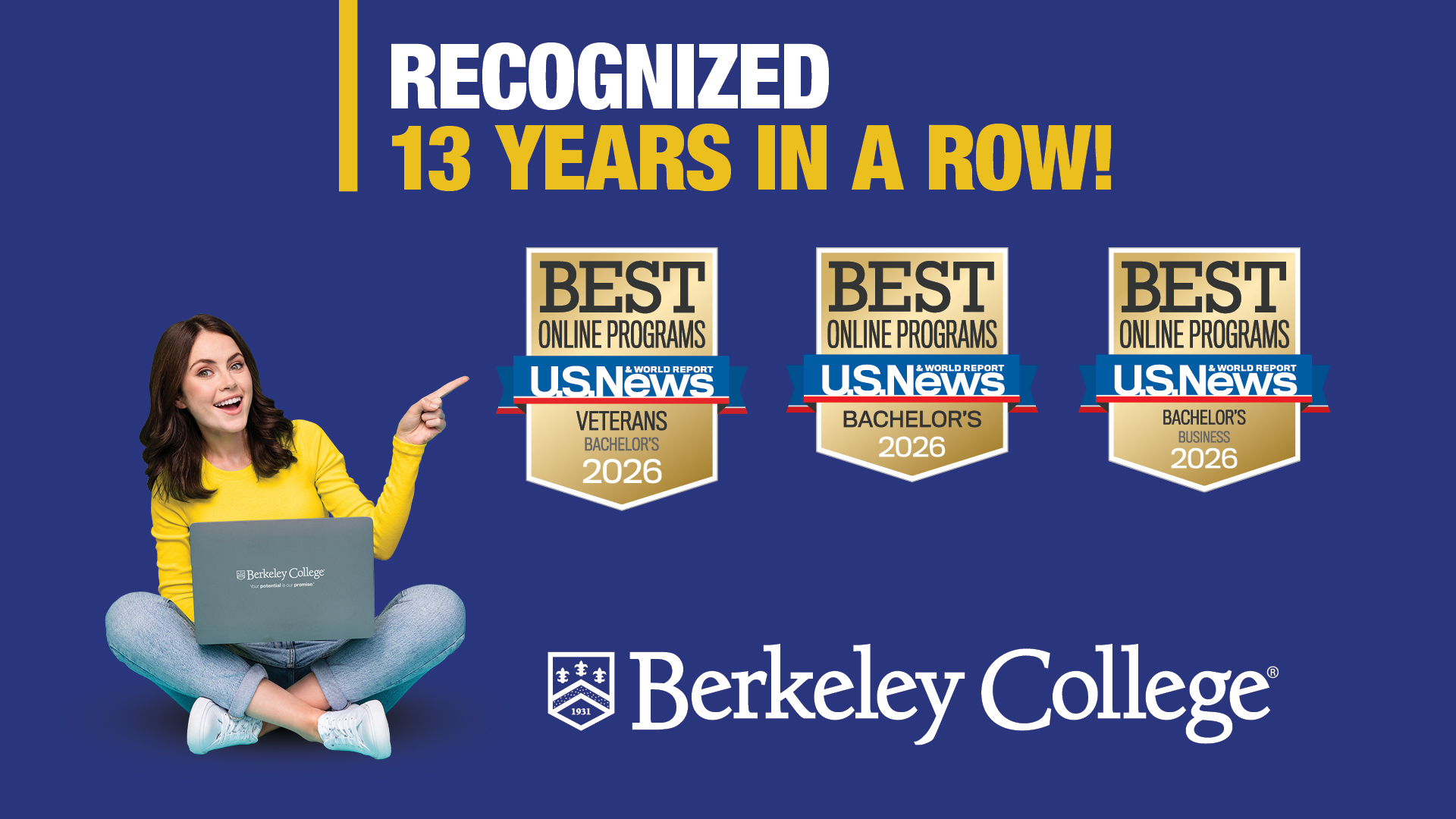 For the 13th consecutive year, U.S. News & World Report has ranked Berkeley College among the Best Colleges in the nation for Online Bachelor’s Degree Programs. The ranking also recognizes Berkeley College among the Best Online Bachelor’s Degree Programs for Veterans and in the category Best Online Bachelor’s Degree Programs – Business. The Berkeley College Master of Business Administration (MBA) in Management program is included on the list of Best Online MBA Programs.